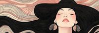 Rustgevende Vrouw Met Zwart Haar - Op dit vrouwen schilderij zie je een vrouw met een grote zwarte hoed, een ontspannen gezicht en sierlijke golven van haar die door pastelachtige kleuren van roze en beige passen, wat een rustgevende sfeer creëert.