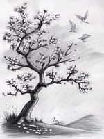 Een zwart-wit poster met een rustgevende boom die zich uitstrekt naar de hemel, omringd door een serene stilte. De takken buigen zachtjes onder het gewicht van de bladeren, terwijl vogels rusten en fladderen in de kruin. Het beeld straalt een gevoel van vrede en kalmte uit, waarbij de majestueuze boom een toevluchtsoord biedt voor rust…