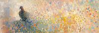 Rustic Charm of Dawn's Light - Dit kippenschilderij dompelt ons onder in een wereld van impressionistische schoonheid waar kleuren harmonieus mengen. Op de voorgrond staat trots een haan, uitgevoerd in een mozaïek van donkere groenen, blues en hints van oranje en rood, die sterk contrasteren met de luchtige, lichte achtergrond. De…