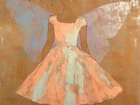 Rustic Elegance Revealed - Dit vrouwen schilderij toont een gestileerde, abstracte figuur van een vrouw met grote, vleugelachtige elementen op de rug, uitgevoerd in zachte pasteltinten tegen een ruwe, industrieel ogende achtergrond met roestrode en bruintinten.
