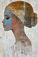 Details: vrouwenportret, hoofdtooi, industrieel, verweerd, aardetinten, blauw, patina, kunst, urban,…