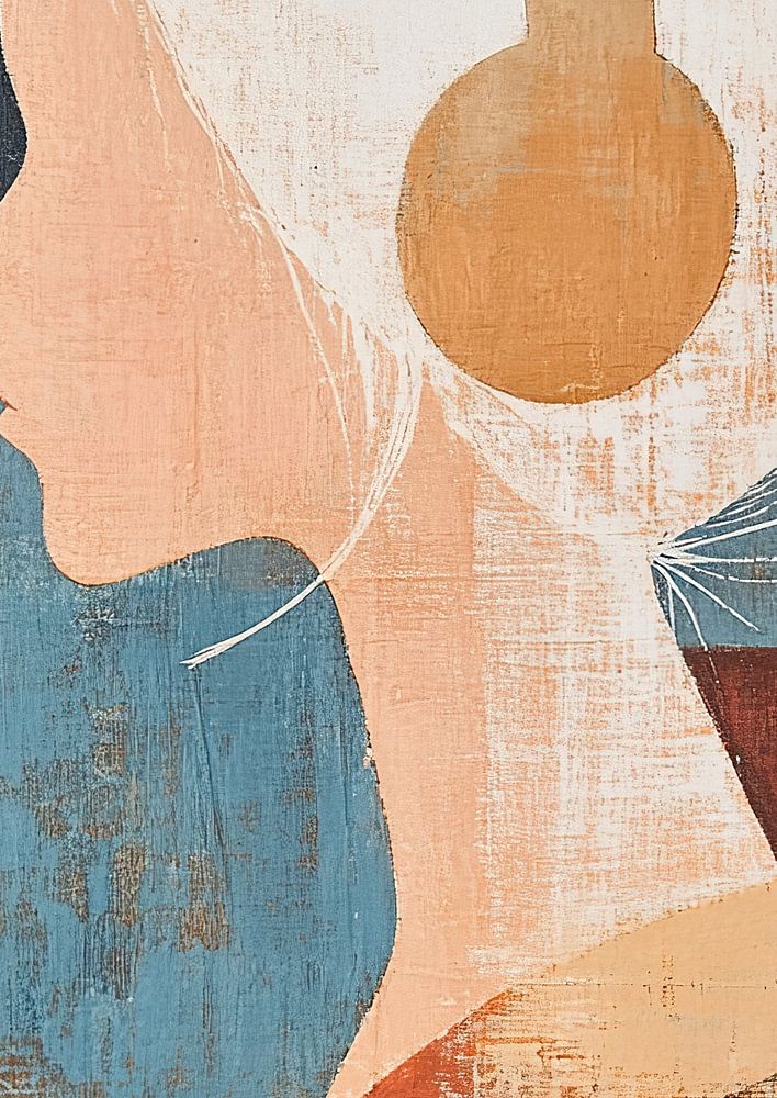 Rustic Melody Mosaic - Dit vrouwen schilderij toont een profiel van een vrouw met grote hoofdtelefoon tegen een achtergrond met geometrische, roestachtige en verweerde patronen in tinten blauw en roodbruin.