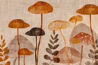 Rustic Silence - Dit paddestoelen schilderij toont een serene en harmonieuze compositie van diverse soorten paddenstoelen en planten op een textuurrijke achtergrond. De paddenstoelen variëren van vorm en grootte, sommigen met mollige, ronde kapjes terwijl anderen meer plat en uitgestrekt zijn. De kleuren van deze paddenstoelen zijn warm en aards: diepe roestbruine tinten, zachte tussenvormen van beige, en donkere chocoladebruin. De stelen zijn elegant en dun, sommigen zelfs bijna transparant, wat een contrast vormt met de solide, robuuste kapjes. Het geheel wordt verrijkt met subtiel ingetekende blaadjes die variëren van klein en rond tot langwerpig en gebogen, uitgevoerd in donkerbruine en gouden tinten. De achtergrond is een lichte, geweven canvasachtige textuur die een rustieke ambiance verleent aan het schilderij. De stijl van het kunstwerk benadert een moderne illustratie met een subtiele hint van vintage flair, waardoor het een tijdloze uitstraling krijgt die zowel rustgevend als intrigerend is.