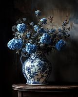 Dit stilleven vangt een moment van subtiele sereniteit, waarin het klassieke Delfts blauw en de schoonheid van eenvoudig licht perfect samenkomen. Een vaas in de karakteristieke blauwe en witte patronen staat op een verweerde houten tafel, met de zorgvuldig gedetailleerde lijnen van het porselein die de aandacht trekken. De vaas zelf lijkt te ademen in het zachte, warme licht dat van links binnenvalt, en het delicate blauw van de bloemen op de vaas komt tot leven in de schittering van het zonlicht.