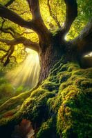 Een majestueuze boom met heldergroen gebladerte en een massieve, met mos bedekte wortelstructuur trekt ieders aandacht. Zachte lichtstralen dringen door het gebladerte en creëren een bijna magische sfeer. Dit kunstwerk is ideaal voor in de woonkamer, waar het een rustgevende nabijheid tot de natuur en een gevoel van ontspanning…