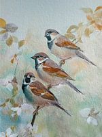 Koop dit schilderij Rustiek en Landelijk. Drie huismusjes op appelbloesemtak van Studio Pieternel als reproductie op canvas, aluminium dibond, (ingelijste) fotoprint, behang en ArtFrame, op maat geprint in Fine-Art kwaliteit.