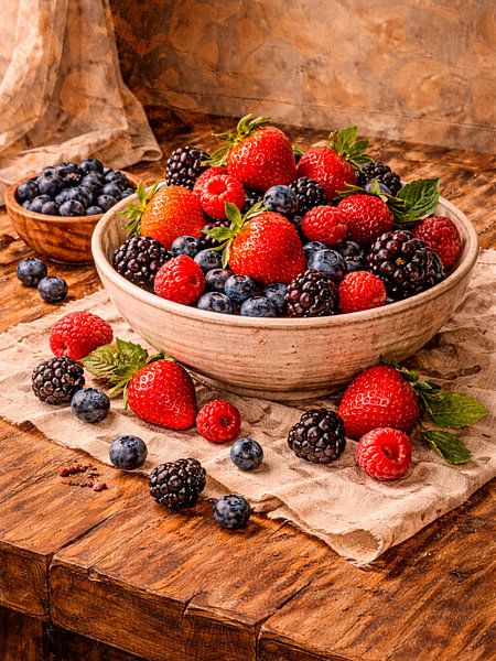 Een warme rustieke stillevenfoto van verse gemengde bessen op een houten tafel. Perfecte muurkunst voor keukens, eetkamers en boerderijinterieurs.