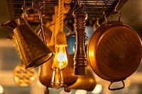 Centraal in de compositie hangt een warme, gloeiende Edison-stijl lamp aan een dik touw, die het koperen en bronzen keukengerei, zoals pannen, kannen en lepels, prachtig verlicht.