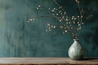 Deze afbeelding straalt een serene rust uit door de combinatie van een handgemaakte keramische vaas en subtiele, gedroogde takken. De achtergrond in een zachte, groenblauwe tint creëert een harmonieus contrast met de aardse kleuren van de vaas en het hout. Dit ontwerp is perfect voor interieurs met een minimalistische of Japandi-stijl,…