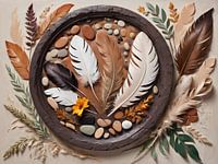 Dit kunstwerk biedt een harmonieus samenspel van natuurlijke elementen zoals veren, stenen en bladeren, zorgvuldig gerangschikt in een cirkelvormige compositie. De neutrale aardetinten, gecombineerd met subtiele accenten van wit, crème en oranje, creëren een serene en rustgevende sfeer. Het werk roept associaties op met rustieke…
