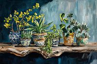 Dit stilleven vangt de rustige elegantie van een verzameling diverse planten, liefdevol geplaatst in traditionele Bunzlau-potten met een blauw-wit-geel kleurenpalet. De potten, met hun delicate patronen en zachte tinten, staan op een verweerde houten plank die de algehele rustieke sfeer versterkt. De achtergrond bestaat uit subtiele schakeringen van donker- en lichtblauw, die een serene en dromerige ambiance creëren. De combinatie van de natuurlijke schoonheid van de planten en de ambachtelijke details van de potten vormt een harmonieuze balans tussen eenvoud en verfijning. Artist Bianca ter Riet. Passend bij diverse stijlen en trends, waaronder stilleven, botanisch en blauw.