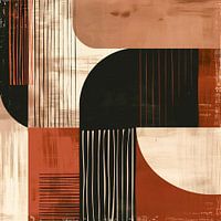 De rechte en gebogen lijnen in dit werk creëert een sterk contrast tussen de robuuste roestkleuren en de zachte crèmetonen. Dit stuk vangt een evenwicht tussen organische vormen en gestructureerde patronen, wat resulteert in een rustgevende maar dynamische compositie. Het zou een elegante toevoeging zijn aan een modern interieur, waarbij de warmte van de kleuren een aangename sfeer creëert.
