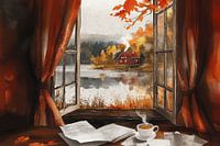 Een sfeervolle illustratie dat een intiem moment vastlegt, gezien door een open raam met warme rode gordijnen. Het uitzicht toont een idyllisch rood huisje aan een mistig meer, omringd door herfstbomen in vurige tinten. Op de vensterbank ligt een opengeslagen boek naast een dampende kop koffie, wat een gevoel van rust en gezelligheid oproept tegen de achtergrond van het herfstige landschap.