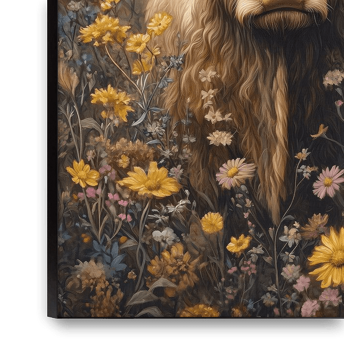 Dit schilderij vangt de essentie van rustieke elegantie met een Schotse hooglander omgeven door een kleurrijke bloemenzee. De zachte kleuren van de bloemen in geel, roze en paars vormen een harmonieus contrast met de warme, ruige vacht van de hooglander. De serene blik van het dier straalt kalmte uit, terwijl de delicate details van de…