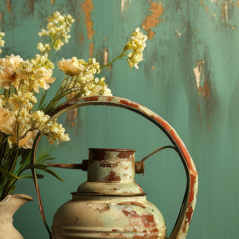Een vergeten ruimte komt tot leven in deze afbeelding, waar een oude, roestige gieter zijn verhaal vertelt.