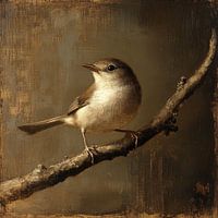 klassiek en realistisch portret van een kleine vogel, waarschijnlijk een nachtegaal, die op een tak zit. Het werk wordt gekenmerkt door een warme, aardse sfeer, gecreëerd door het gebruik van zachte bruintinten, goudachtige accenten en een subtiele lichtval die de vogel en tak prachtig benadrukt. De achtergrond is gedempt en wazig, wat…