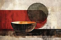 Rustieke Stilte | Rustieke Kom - Dit abstracte schilderij toont een prominent beeld van een grote, diepe kom met zwarte lijntekeningen op een ondergrond met rustieke texturen in rood en beige, met een grote, vage cirkel op de achtergrond die een sereen contrast vormt.