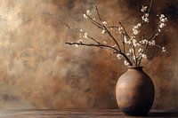 Dit verfijnde ontwerp straalt een rustieke elegantie uit met een prachtige, handgemaakte keramische vaas gevuld met delicate bloesemtakken. De warme aardetinten van de achtergrond harmoniëren perfect met het natuurlijke ontwerp, waardoor een sfeer van eenvoud en sereniteit ontstaat. Perfect voor het decoreren van interieurs zoals woonkamers of eetkamers, dit kunstwerk voegt een vleugje tijdloze schoonheid toe aan elke ruimte. Ideaal voor wie houdt van minimalistische of Japandi-stijl interieurs.
