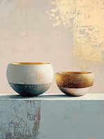 Rustieke kommen | Serenity in Stillness - Dit stilleven schilderij toont twee rustieke kommen, één met een zilveren en blauwe buitenkant en de andere goud en bruin, beide op een zachtgrijze ondergrond met een grof getextureerde, goud-beige achtergrond.
