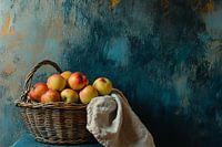 Deze prachtige afbeelding toont een rustieke mand gevuld met verse appels, perfect in balans met een achtergrond van diepe blauw- en aardetinten. De compositie ademt eenvoud en elegantie, ideaal om je interieur een warme, landelijke uitstraling te geven. De heldere kleuren van de appels contrasteren prachtig met de donkere, verweerde muur, waardoor dit ontwerp een opvallend accent vormt. Perfect voor in de keuken of woonkamer, als een subtiel eerbetoon aan de charme van het plattelandsleven.