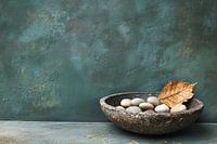 Een minimalistisch en sfeervol ontwerp dat een serene sfeer in je interieur brengt. De verweerde stenen schaal met gladde, natuurlijke stenen en een enkel herfstblad op een zachte groen-blauwe achtergrond roept een rustgevende, tijdloze uitstraling op. Perfect voor het creëren van een rustige ambiance in woonruimtes zoals de slaapkamer…