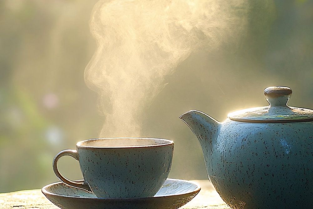 Geniet van een rustiek moment met deze sfeervolle foto van een keramische theepot en bijpassende theekop op een stenen tafel in een groen, zonovergoten landschap. De zachte, aardse kleuren en de warme damp van de thee stralen een gevoel van rust en eenvoud uit, perfect voor wie verlangt naar een moment van ontspanning. Dit beeld past prachtig in landelijke en minimalistische interieurs en voegt een vleugje natuur toe aan elke ruimte, of het nu de keuken, eetkamer of slaapkamer is.