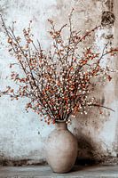 Een stijlvolle toevoeging aan elk interieur, deze rustieke vaas met delicate oranje en witte takken straalt een tijdloze elegantie uit. Perfect voor minimalistische en Japandi-interieurs, dit ontwerp combineert natuurlijke eenvoud met een verfijnde uitstraling. De neutrale tinten van de vaas en de warme accenten van de takken creëren een harmonieus geheel dat zowel rustgevend als visueel aantrekkelijk is. Plaats het in een woonkamer of hal om een subtiele, maar toch opvallende decoratieve toets toe te voegen aan de ruimte.