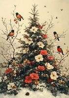 Een charmante kerstboom met levendige bloemen- en hartmotieven op een verweerde achtergrond.