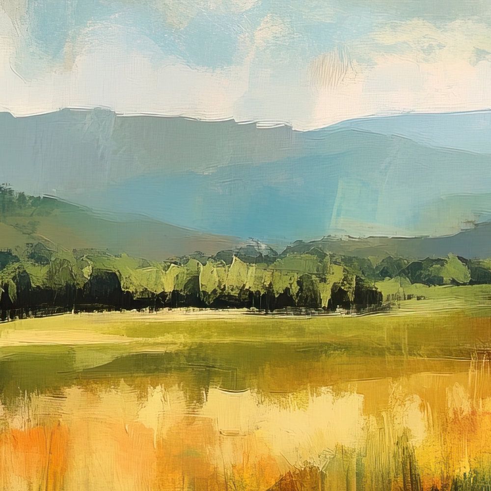 Rustig Landschap met Heuvels en Veld - Dit is een landschap schilderij met groene heuvels en een brede goudgele veld onder een blauwe lucht vol wolken, wat het gevoel van een rustige natuurscène oproept.