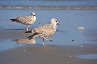 Een meeuw loopt rustig over het strand