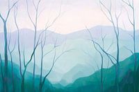 Een zachte mist omhult de glooiende heuvels in mysterieuze tinten blauw en groen. De filigraan takken verstrengelen zich elegant over het lieflijke landschap en geven het beeld een dromerige, stemmige sfeer. Ideaal voor de slaapkamer, het creëert een rustgevende sfeer die uitnodigt om te ontspannen en je gedachten te laten dwalen.