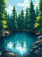 Een sereen schilderij met de schoonheid van een stilstaand meer dat een weelderig groen bos weerspiegelt onder een heldere, bewolkte hemel. Het kunstwerk roept een gevoel van vrede en verbondenheid met de natuur op.