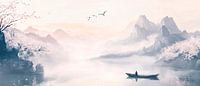 Zachte mist omhult majestueuze bergen, terwijl een eenzaam bootje over het spiegelgladde wateroppervlak glijdt. De delicate pastelkleuren creëren een vredige sfeer die uitnodigt om te dromen. Dit werk is ideaal voor de slaapkamer of een creatieve studeerkamer en brengt rust en inspiratie in je toevluchtsoord.