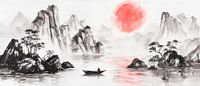 Een zachte zonsondergang baadt het landschap in warm, rood licht, terwijl een eenzame boot rustig in het water schommelt. Majestueuze bergen en delicate bomen omlijsten het tafereel en creëren een gevoel van rust. Dit kunstwerk brengt harmonieuze elegantie in elke woonkamer en nodigt je uit om te dromen en te ontspannen.