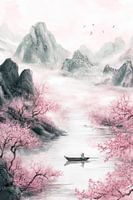Een harmonieus landschap ontvouwt zich in zachte pastelkleuren, met roze bloeiende kersenbomen langs de oevers. Een eenzame boot glijdt kalm over het water, omringd door majestueuze bergen en een vleugje mist. Dit vredige landschap geeft de woonkamer een ontspannen sfeer en nodigt uit om te blijven hangen.