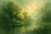 Zacht ochtendlicht zweeft over een mistig bosmeer, waar bomen in waasvormen oprijzen en het spiegelende water kleine golfjes vangt. Zachte penseelstreken vervagen randen, waardoor diepte en rust ontstaan. Een sluier van nevel legt een kalme toon over het landschap, terwijl lichter gekleurde openingen tussen de kruinen subtiel oplichten.…