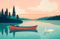 Hier ontvouwt zich een harmonieus samenspel van zachte kleuren en rustige landschappen: Een rode kano schommelt zachtjes op het spiegelgladde water, terwijl een elegante zwaan zijn pad kruist. Dit vredige tafereel creëert een rustgevende sfeer in elke kamer - ideaal voor een slaapkamer of woonkamer waar rust en ontspanning heersen.