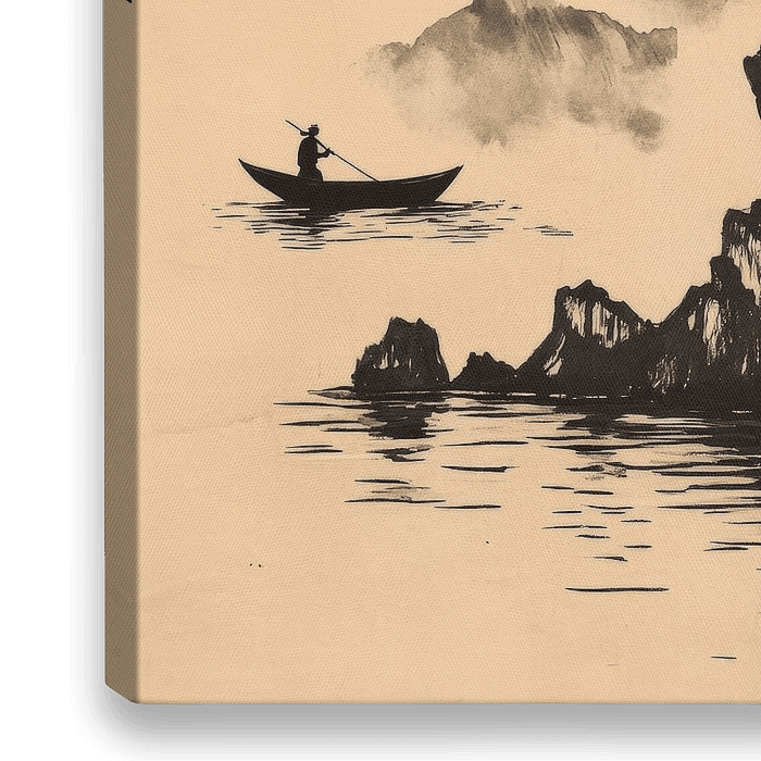 Een krachtige rode bol van zonlicht trekt de aandacht, terwijl een eenzame visser rustig in een bootje op reflecterend water roeit. De delicate contouren van de vervagende kliffen en het rustige landschap geven het motief een meditatieve diepte. Perfect voor in de woonkamer om ontspannende gespreksmomenten te creëren.