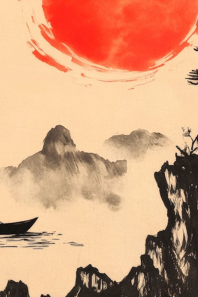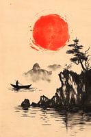 Een krachtige rode bol van zonlicht trekt de aandacht, terwijl een eenzame visser rustig in een bootje op reflecterend water roeit. De delicate contouren van de vervagende kliffen en het rustige landschap geven het motief een meditatieve diepte. Perfect voor in de woonkamer om ontspannende gespreksmomenten te creëren.