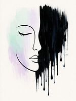 Dit minimalistische abstracte portret geeft de stille tegenstrijdigheid weer waarmee veel mensen dagelijks leven. Een sereen vrouwengezicht, weergegeven in delicate lijntekeningen, oogt kalm, beheerst en introspectief. De ene helft van het gezicht is gevuld met zachte pastelkleurige penseelstreken in mint- en lavendeltinten, die…