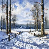 Rustig winterlandschap met besneeuwd pad. Een sereen winters tafereel ontvouwt zich terwijl een rivier zich een weg baant door een landschap bedekt met sneeuw. De lucht erboven is lichtblauw, wat suggereert dat het vroeg in de ochtend of laat in de middag is. Aan de linkerkant van de afbeelding staan bomen hoog met hun kale takken die naar de lucht reiken. In de verte rollen heuvels onder de uitgestrekte lucht, wat diepte toevoegt aan het tafereel. Een paar stukken met sneeuw bedekte grond zijn zichtbaar tussen de bomen en struiken langs de rivieroever. De algehele stemming is vredig en stil, een momentopname van de schoonheid van de natuur in de winter.