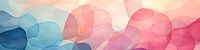 De kleuren variëren van diepe, verzadigde blauwtinten tot zachte perzik en levendige roze tinten, wat een gevoel van dynamiek en beweging creëert. Het gebruik van aquareltechniek geeft de afbeelding een dromerige, etherische kwaliteit, met transparante overlappen die diepte en complexiteit toevoegen. De vloeiende vormen en subtiele schaduwpartijen suggereren een landschap gezien door een nevelige waas, waardoor de kijker wordt uitgenodigd tot introspectie en kalme overpeinzing. Er is een balans tussen warme en koele tonen die zowel rustgevend als opbeurend is, en het geheel ademt een atmosfeer van rust en harmonie.