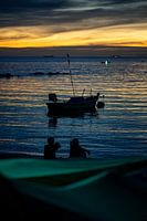 Een kalme en sfeervolle zonsondergang waarbij een vissersboot zachtjes dobbert op het glinsterende water. Op de voorgrond zitten twee mensen stil en genieten van het serene moment, terwijl de lucht boven de horizon een prachtig palet van oranje en blauw toont.