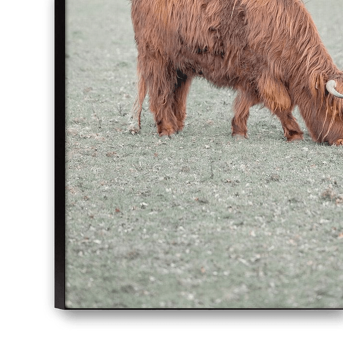 Deze foto, die een enkele Schotse Hooglander toont die vredig graast, belichaamt de rust van het leven op het platteland. De warme tinten van de vacht van het dier contrasteren subtiel met de koelere, gedempte kleuren van de winterse omgeving. Het moment wordt versterkt door de natuurlijke gratie van de Hooglander, wiens houding zowel eenzaamheid als tevredenheid uitstraalt. Dit beeld, ideaal voor zij die de serene kant van het plattelandsleven willen vieren, is een oase van rust in elke ruimte.