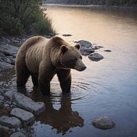 In dit schilderij staat een grote bruine beer kalm in een rivier, omgeven door de serene natuur. De reflectie in het water en de zachte kleuren van de ondergaande zon creëren een rustige sfeer. De beer, als symbool van kracht en rust, staat centraal in deze harmonieuze scène van de wilde natuur.