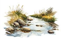 Dit serene ontwerp toont een rustige kreek die door een natuurlijke omgeving stroomt. De subtiele kleuren en minimalistische stijl creëren een kalmerend effect, perfect voor ruimtes waar rust en ontspanning gewenst zijn. Het beeld van het water dat zachtjes over de rotsen stroomt, gecombineerd met het delicate gras en de struiken aan de oever, brengt de schoonheid van de natuur naar binnen. Dit kunstwerk is een ideale aanvulling voor elke ruimte die een vleugje natuur en sereniteit nodig heeft, zoals een slaapkamer of eetkamer.