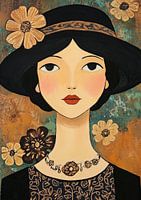 Rustige Vrouw in Bloemenomgeving - In dit vrouwen schilderij zie je een vrouw met een zwarte hoed en een grote bloem in haar haar, omringd door bloemen en een warme, rustgevende achtergrond.