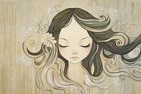 Rustige Vrouw - Op dit vrouwen schilderij zie je een rustige vrouw met gesloten ogen en een bloem in haar haar, omringd door zachte, golvende lijnen die een gevoel van sereniteit uitstralen.