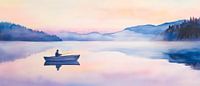Zachte pastelkleuren omhullen het kalme meer terwijl een eenzame figuur in een bootje de ochtend tegemoet peddelt. Het mistige landschap geeft een gevoel van vrede en ontspanning. Dit harmonieuze beeld brengt een rustgevende sfeer en is perfect voor de slaapkamer om zachte dromen en een gevoel van ruimte te stimuleren.