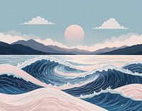 Dit serene digitale kunstwerk legt de vredige schoonheid vast van een kalme zee die een verre kustlijn ontmoet onder een zachte pastelkleurige hemel. Zachte golven, weergegeven in blauwe en lichtroze tinten, rollen naar de kijker toe, hun kruinen subtiel uitgelicht. Aan de horizon zie je wazige bergen en een gedempte zon of maan, die…